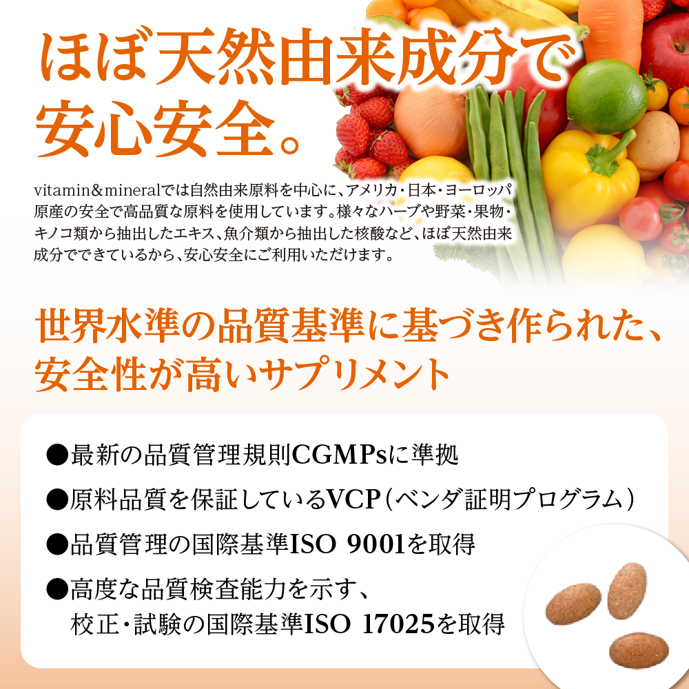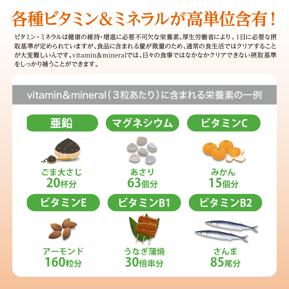 日々の健康維持に欠かせない、高容量のビタミン・ミネラルを含みます。