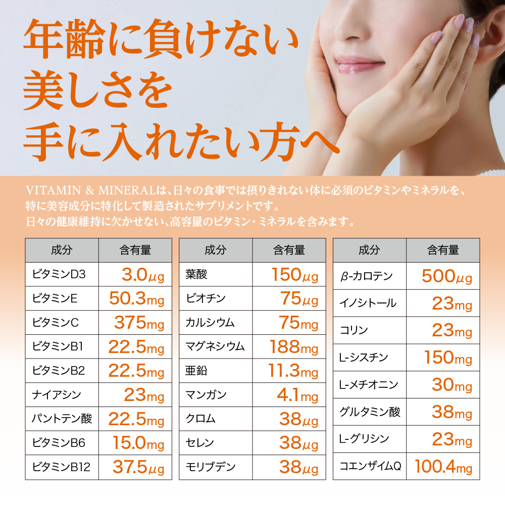 VITAMIN & MINERALは、日々の食事では摂りきれない体に必須のビタミンやミネラルを、特に美容成分に特化して製造されたサプリメントです。