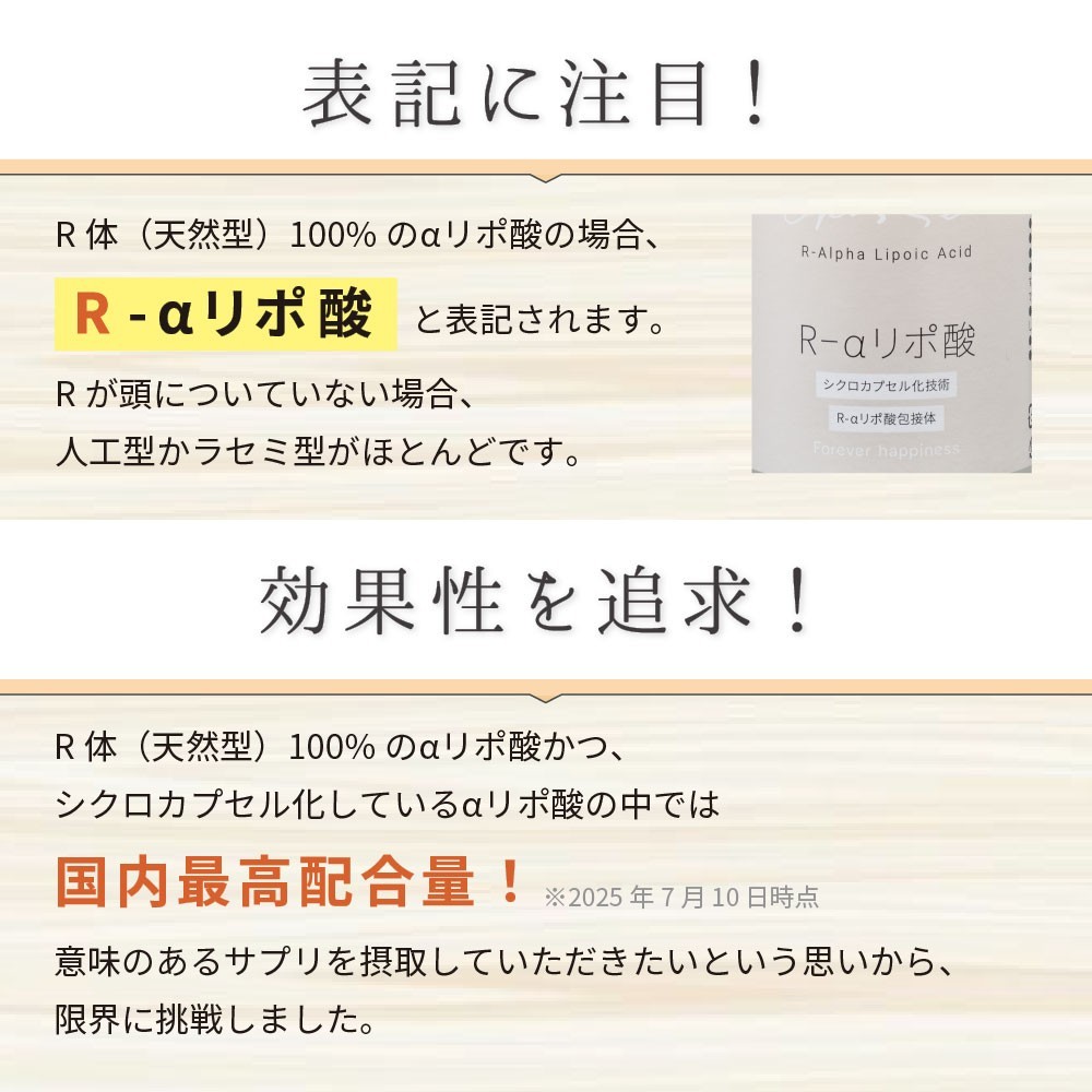 ・R体(天然型)αリポ酸100%を高配合(α-リポ酸(R体)として3粒で60mg) ・使用特許取得中のシクロカプセル技術化で、R体αリポ酸を環状オリゴ糖で包接。安全に、確実に摂取 ・ビタミンB1 、ビタミンB2も配合することで、脂質の代謝をサポート ・植物性のハードカプセル(HPMCカプセル)を使用し、GMP認定工場で製造することで安心安全なサプリへ ・保存料、香料、甘味料、光沢剤、着色料不使用